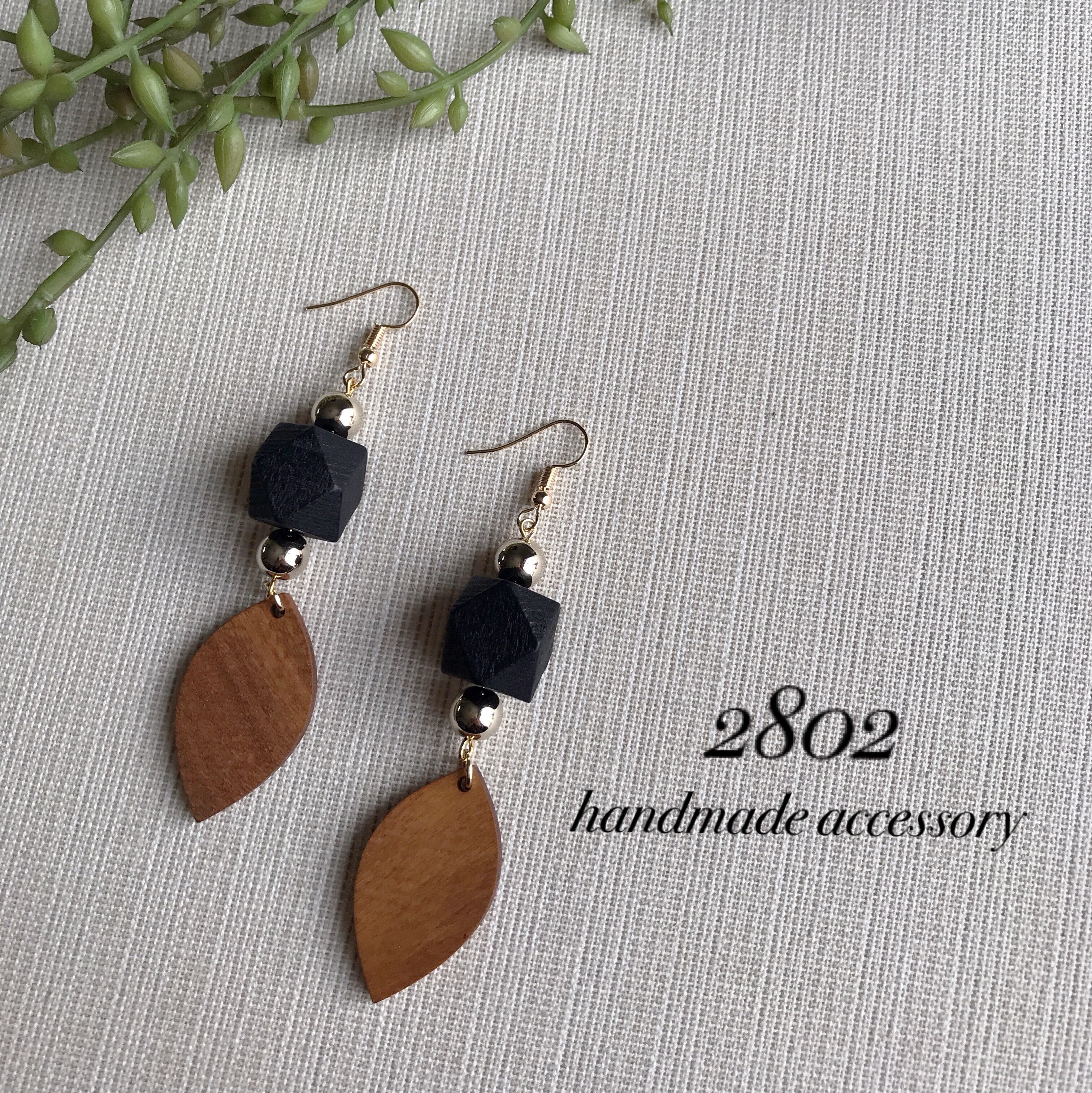 温かみのあるウッドパーツにゴールド玉が映える大振りデザインです♡